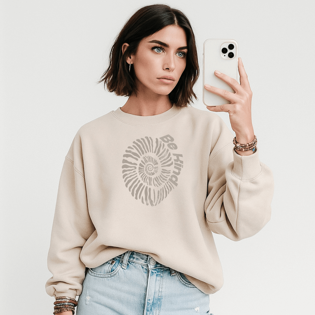 The Be Kind swirl isn't just a graphic — it's a movement. Worn by women who know that kindness isn't weakness, it's the most powerful thing you can lead with. The distressed swirl, the warm sand color, the weight of the fleece — this is the piece you reach for when you want to move through the world with intention.